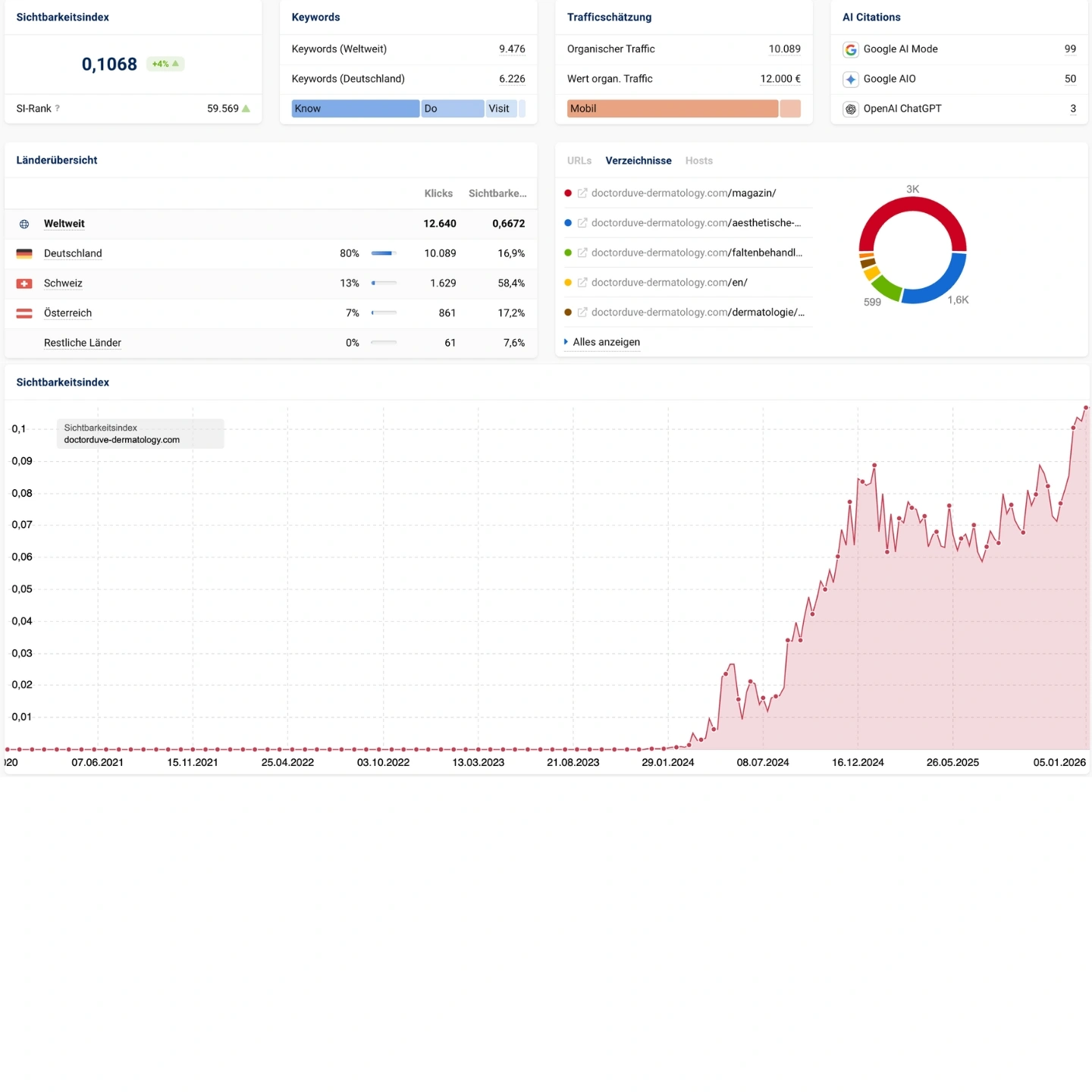 Durch den gezielten Aufbau von medizinischem Fachcontent und einer sauberen technischen Struktur konnten wir die organische Präsenz der Praxis massiv skalieren. Mit über 9.400 gerankten Keywords sichern wir dem Kunden eine dominante Marktposition, die einem monatlichen Werbewert von 12.000 € entspricht.