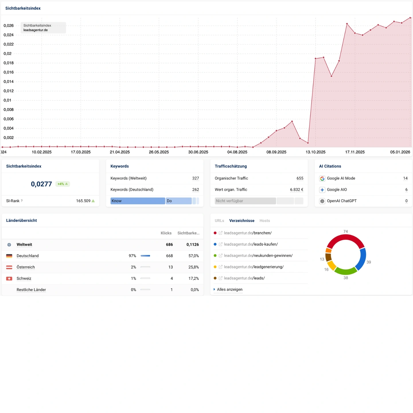 Für unsere eigene Plattform haben wir durch präzises Keyword-Targeting in einem kompetitiven Umfeld ein exponentielles Sichtbarkeitswachstum erzielt. Die Seite generiert nun konstant qualifizierte B2B-Anfragen mit einem organischen Traffic-Wert von über 6.800 € pro Monat.