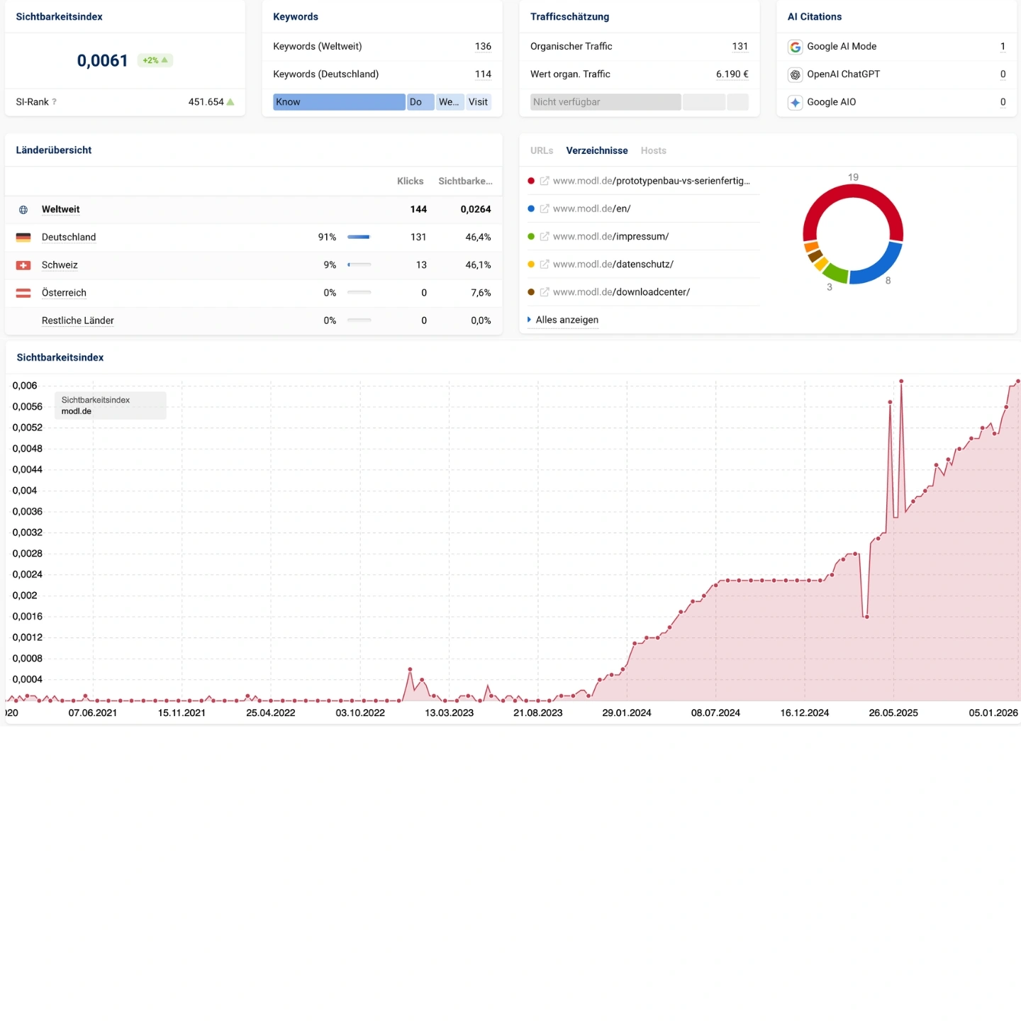 Modl Business-Typ: B2B Website: modl.de Kategorie: SEO Projektjahr: 2025 Wert. organ. Traffic 6.190 € / Monat Branche: Industrie Für MODL haben wir eine Nischenstrategie umgesetzt, die das Unternehmen für hochspezifische Engineering-Anfragen sichtbar macht.Dies sichert dem Kunden eine stabile Zufuhr an qualifizierten Anfragen bei einem Traffic-Wert von monatlich über 6.100 €. Share: WhatsappTwitterFacebookPinterestLinkedinIndustrie