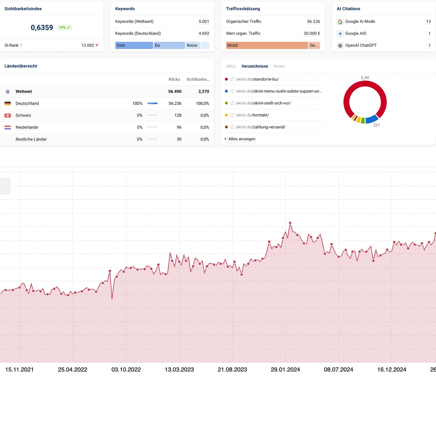 Durch die Besetzung hochrelevanter lokaler und transaktionaler Suchbegriffe haben wir Okinii zur ersten Anlaufstelle in der digitalen Suche gemacht. Mit über 56.000 monatlichen Klicks aus der organischen Suche sparen wir dem Kunden monatlich 30.000 € an Ad-Spend ein.